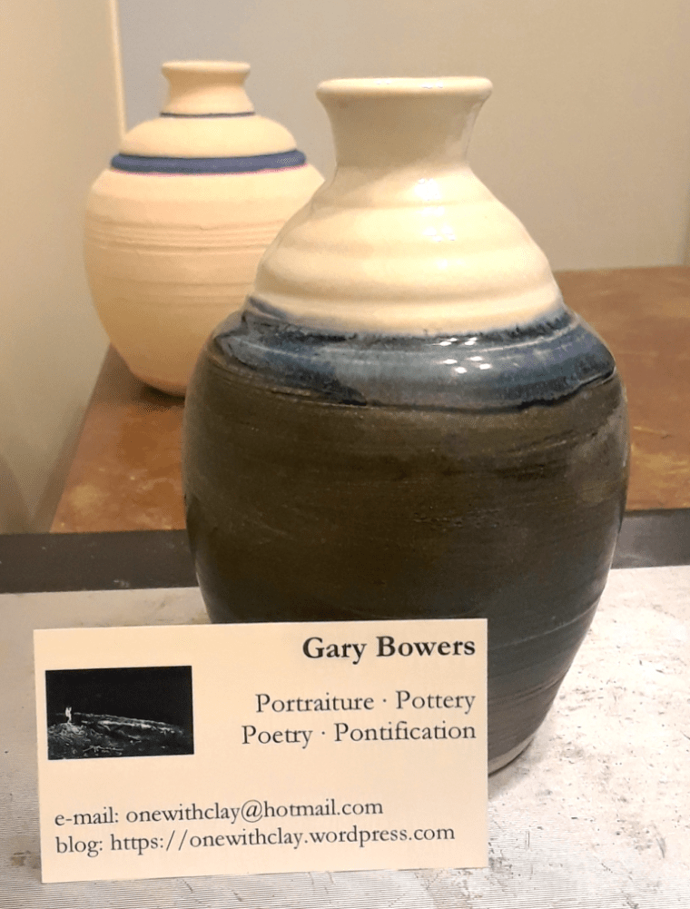 As some of you know, Gary is multi-talented, combing visual art with poetry or prose narrative. He is also a potter. A sample of his work is pictured below. Gary’s pottery is available for purchase. Further details HERE. Note the business care. We appreciate Gary’s wry humor.